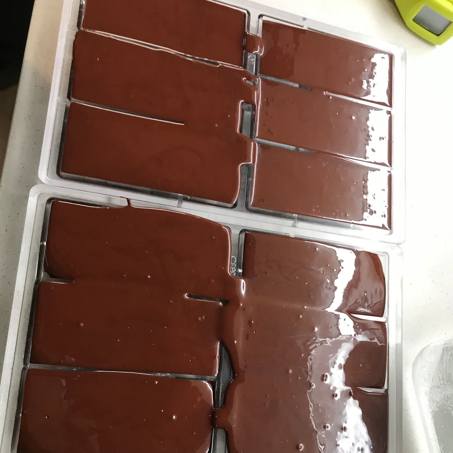 Next we crack, winnow and grind the cacao for 8-10 hours in a stone grinder. Then we mold the liquor and allow to cool before tasting.