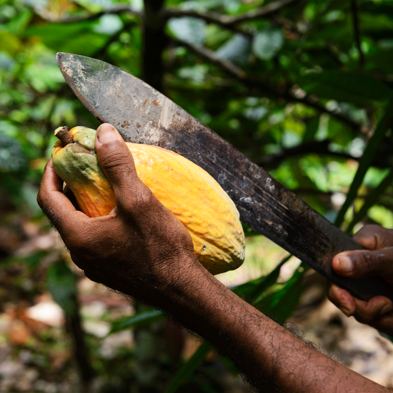 Producing cacao requires patience, commitment, and highly skilled work. From planting a seed or grafting a young seedling to the production of fruit takes at least 18 months, and in many cases as long as three years or more. During this time, young cacao trees must be cleaned of any vines or grasses growing alongside them, and they should be pruned to create the right structure for production. Once the trees start to produce fruit, care must be taken to harvest the cacao at its optimal degree of ripeness.
