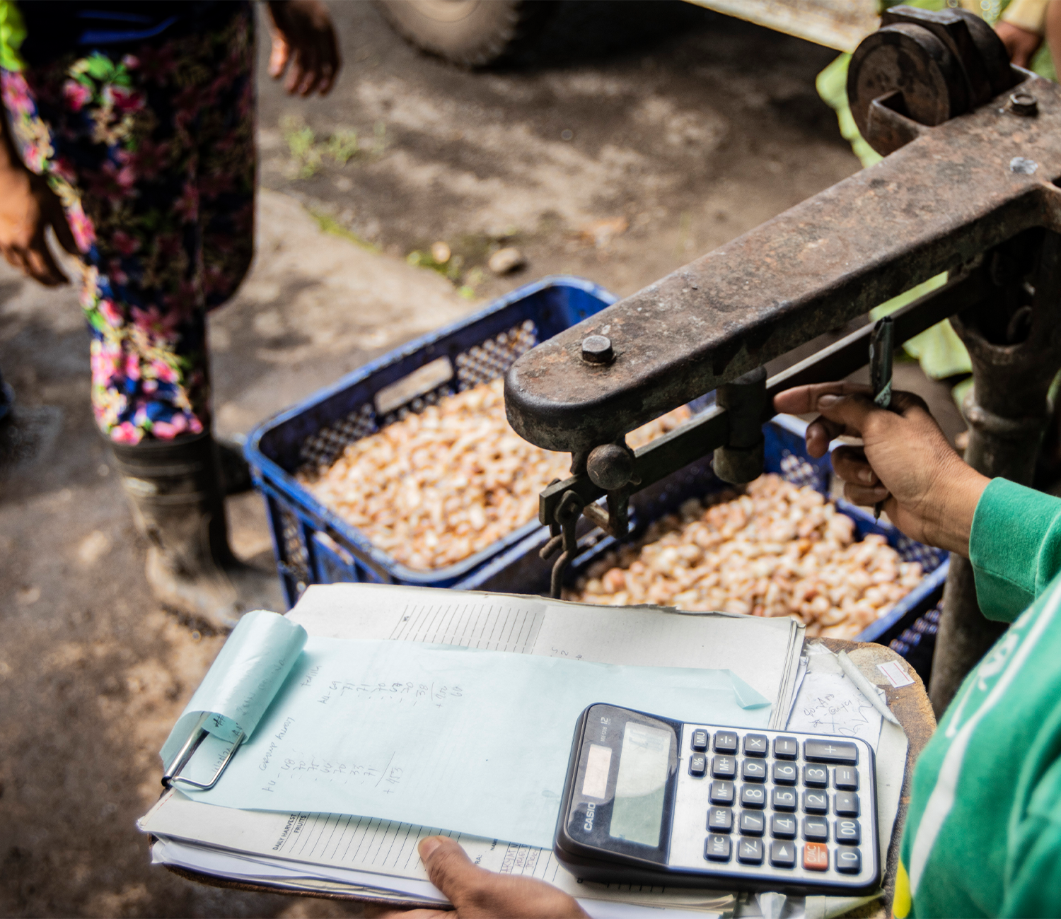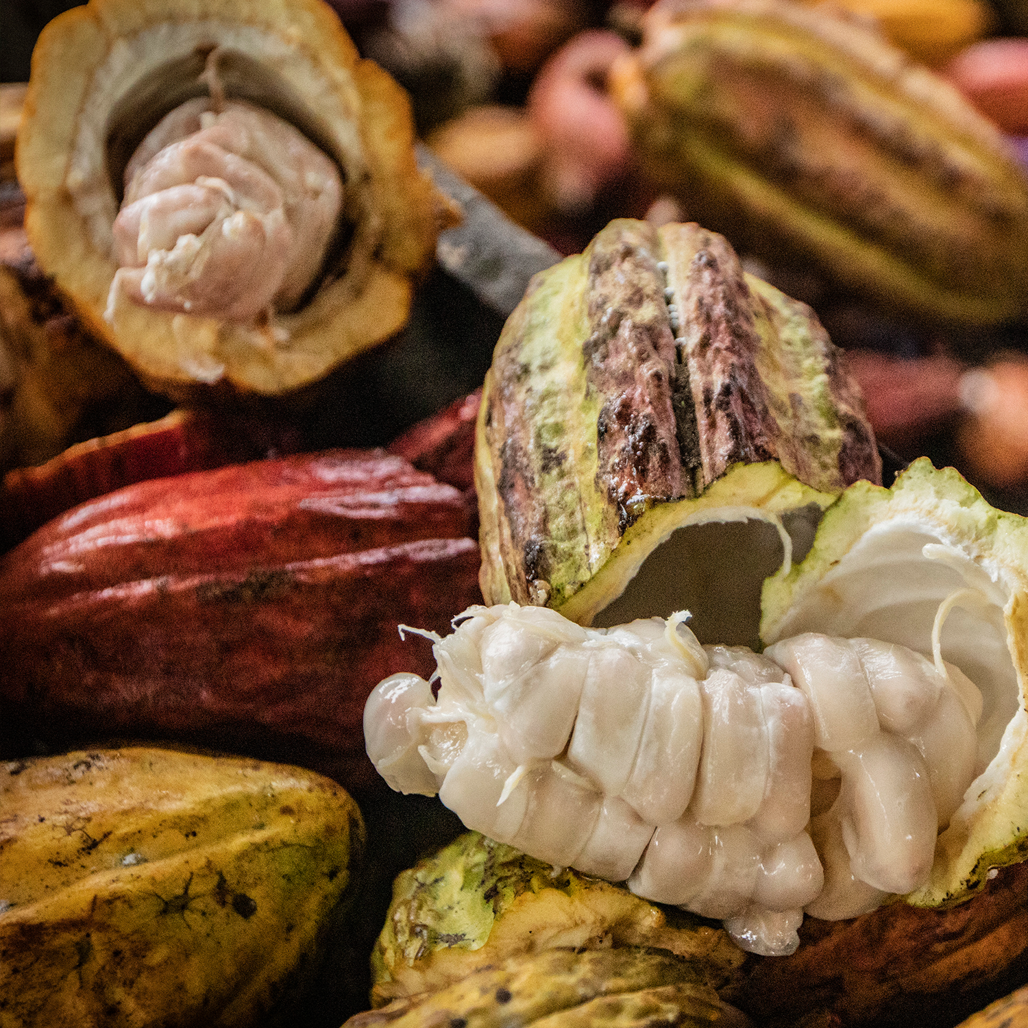 After cacao has been harvested at optimal ripeness, the pod is cracked open, often using a machete, wooden baton, rock, or another pod. Optimal ripeness can be checked by evaluating the sugar content of the pulp, or Brix degrees, which should be between 14-19 degrees. The white-colored pulp, with the cacao seeds (beans) lodged inside, is scooped into a bucket, basket, or bag. The pulp starts to ferment as soon as it touches the air, which is why it is important for controlled fermentation to start soon after pod cracking.