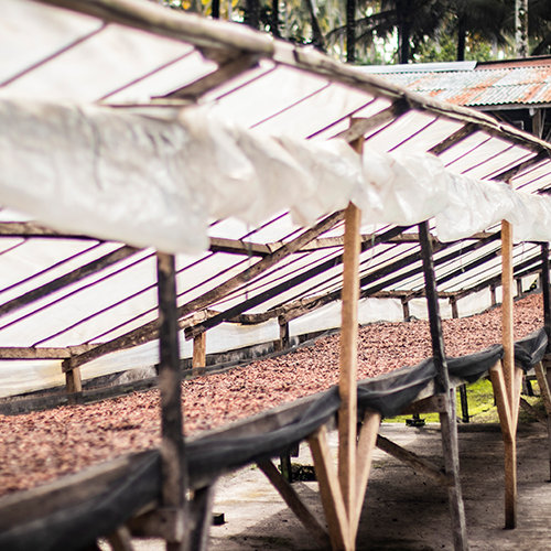 Once cacao has finished fermentation, it will still be a “wet” and sticky texture and must be dried so it can be transported and further processed. Most of the producers that Uncommon sources cacao from will use a slow drying process at the beginning of drying, which enables the acids built up within the cacao seeds during fermentation to slowly release out of the shell. Examples of slow drying approaches include covered drying tables or limited exposure to direct sun for the first several days. Drying too quickly in the initial stage can cause the shell to crisp up, trapping the acids inside and creating a sour flavor.