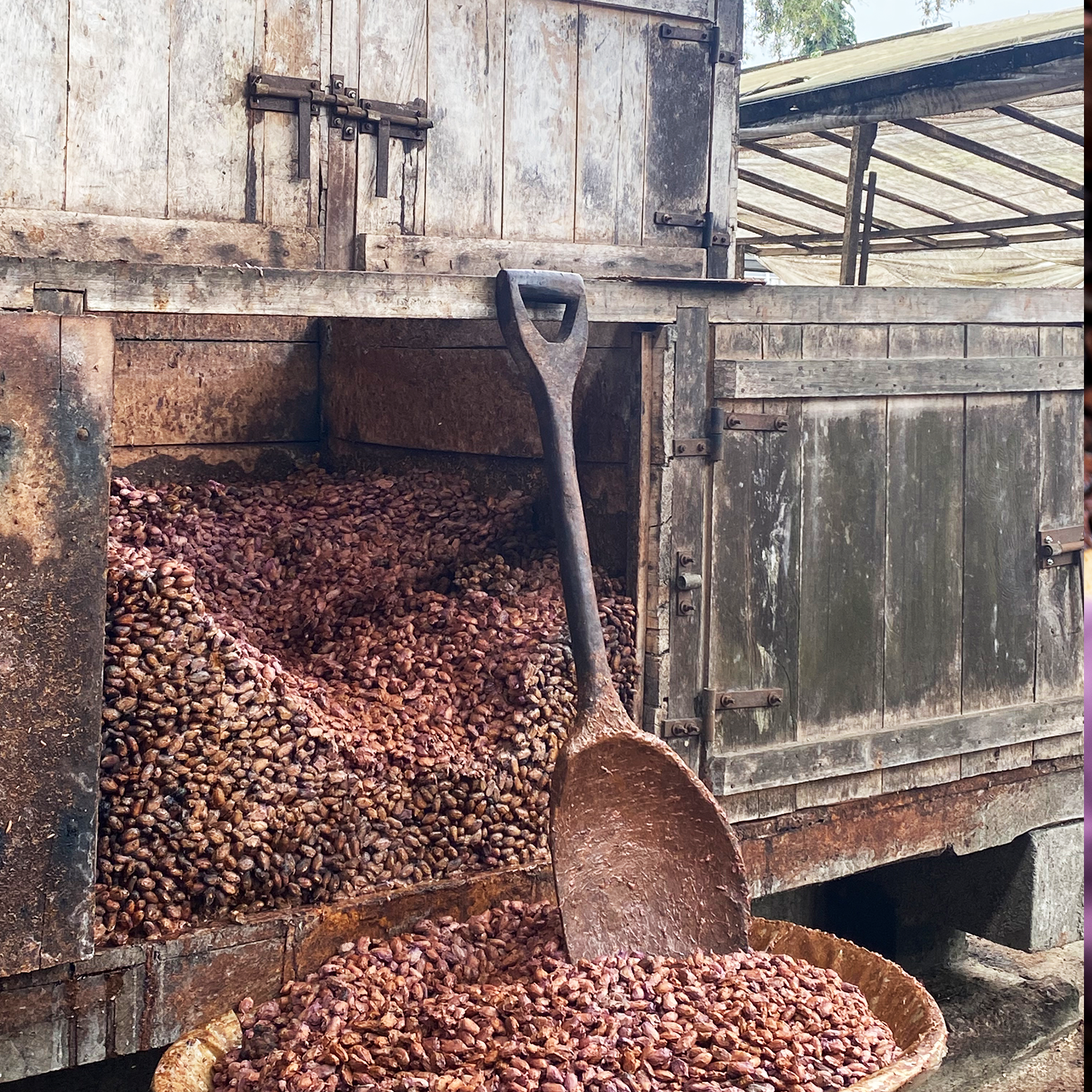 After the first 48 hours, there can be a wide variety of protocols used to continue the fermentation process, but once oxygen has been introduced to the mass the type of fermentation changes to aerobic fermentation. At this time, bacteria takes over, consuming the alcohol produced by the yeasts and converting it into acids. These chemical reactions in the mass and ultimately within the seeds themselves create the flavor precursors for what we eventually will taste in the chocolate.