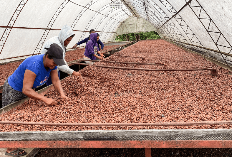 Pictured are Maritza Meregildo, Maria Genao, Alba Iris Rodriguez y Jazmin Garçon working at the drying decks