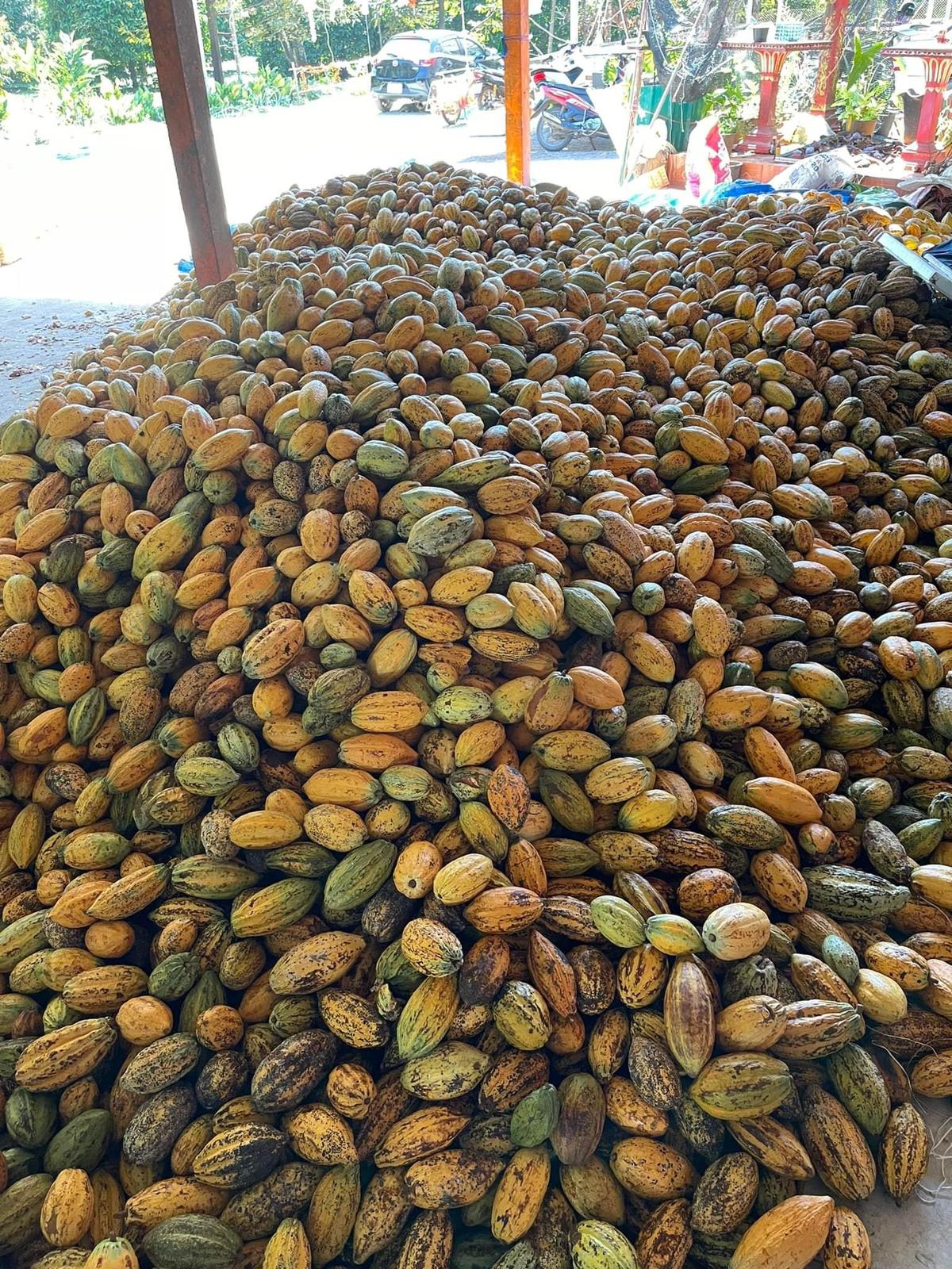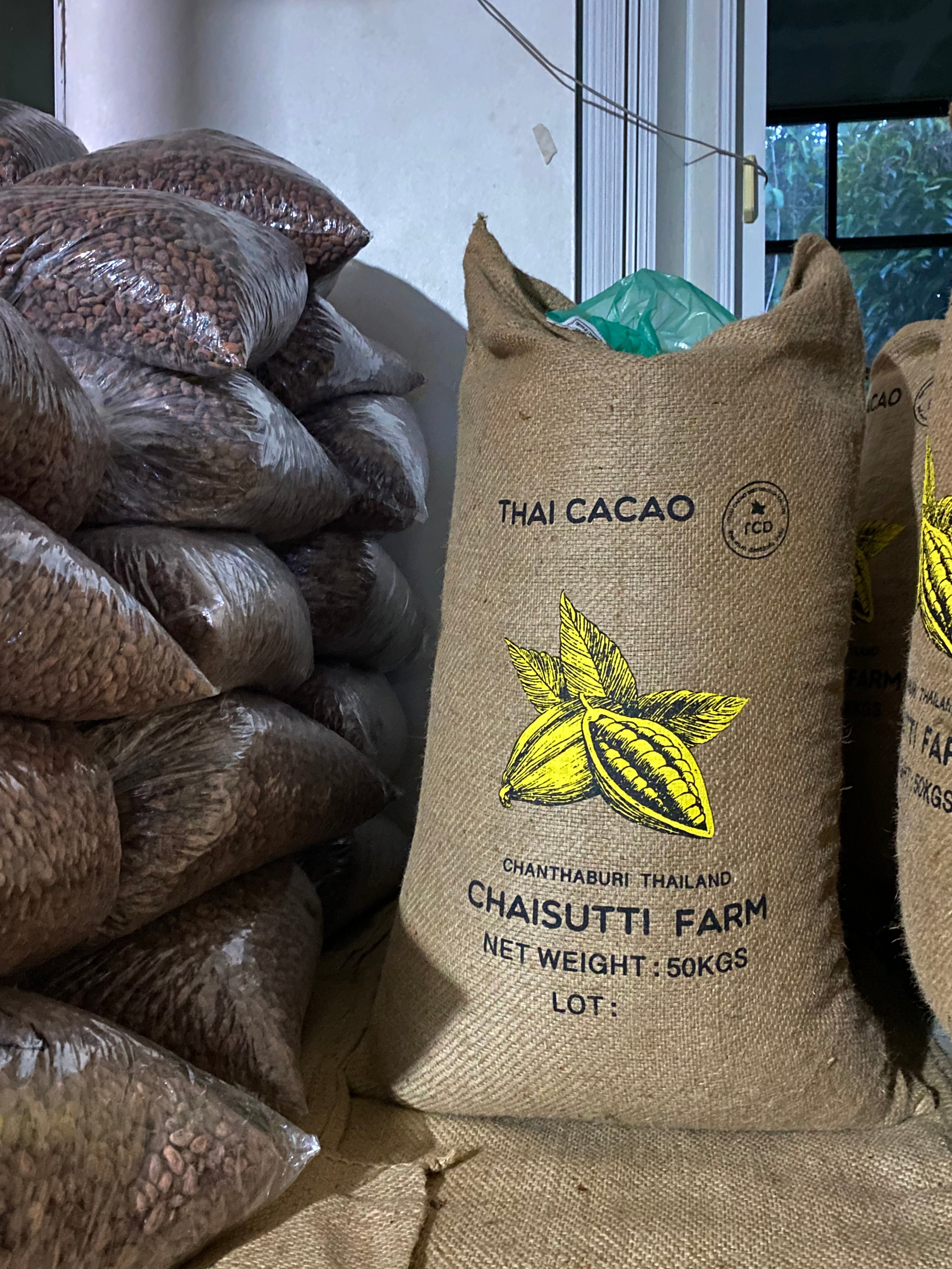 There are 5 "gathering groups" who purchase cacao pods from the producer network every 15 days. The growers in Thailand sell the cacao as whole pods into these gathering groups, who also buy other crops from the farmers. This market structure is driven by cultural practices of how to sell fruit, especially durian, which is the primary crop produced in the Chanthaburi region. Thai Cacao Distribution was founded eight years ago (in 2016) by chef, chocolate maker, and entrepreneur Ryan Berk (Parliament Chocolate). His culinary connections led him to an interest in sourcing cacao from Thailand. Over the last eight years, he and his growing team have developed the largest cacao export operation in the country. They have developed expertise in fermentation and drying practices and closely manage quality to ensure consistent flavor.