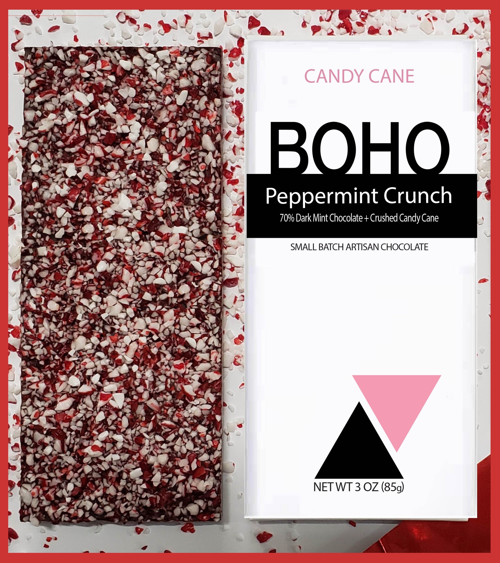 Save 30% on BOHO Chocolate's Peppermint Candy Cane Crunch Bar. Made with organic 70% chocolate from the Alta Verapaz region of Guatemala. Enter save30 at checkout.