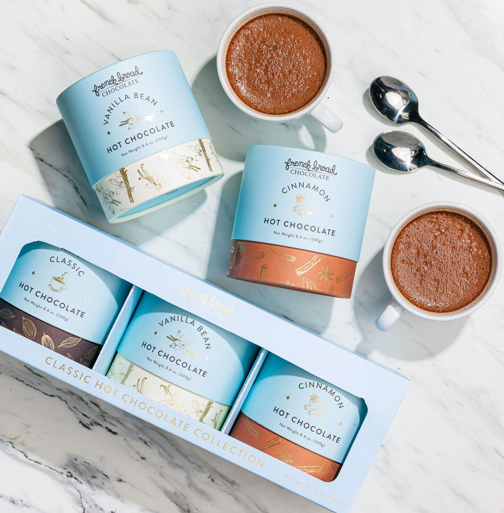 Hot Chocolate Trio - our hot chocolate features our origin blend bean-to-bar dark chocolate, organic cocoa powder, organic powdered sugar, and sea salt, and was included on Oprah's Favorite Things List this year!