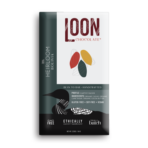 Loon Chocolate's 70% Bolivia bar is made with wild heirloom cacao beans, and a portion of sales support the non-profit Heirloom Cacao Preservation fund. Use discount code "UNCOMMON" for a discount of 10% off their entire order from our online shop! Good through 12/31/24.
